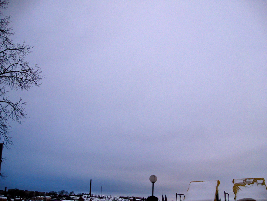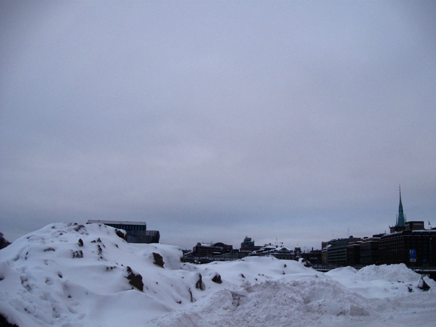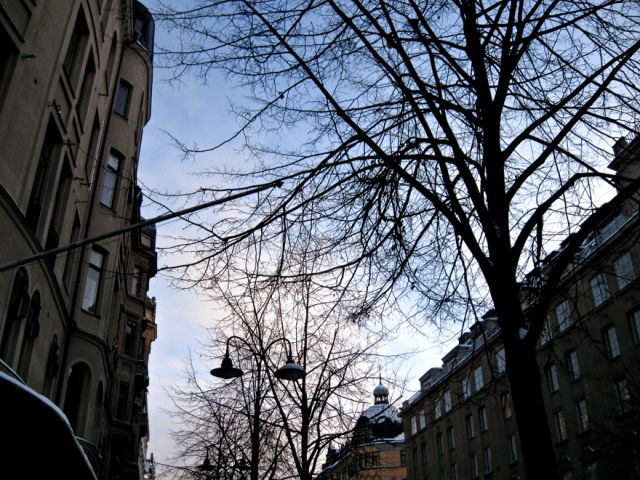 Une mince couche de soleil à peine visible sur les toits des plus hauts bâtiments donne l’effet de rayons dispersés horizontalement, entre la tête et les cieux. Le matin, les gens se promènent encore dans le noir alors que les oiseaux volent au plein jour. Plus tard, un cercle de couleurs qui n’arrive pas tout à fait à éclairer la ville excite le regard et l’apaise à la fois : bleu, rose, blanc, gris, encore bleu. On croirait que dans le ciel se sont posées les couleurs de toutes les heures du jour concentrées dans une lumière mate comme si elle s’empressait à s’exhiber avec l’élégance des suédois, avant que la nuit ne vienne la vaincre.