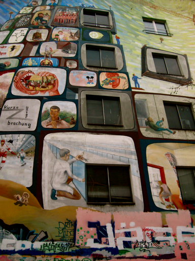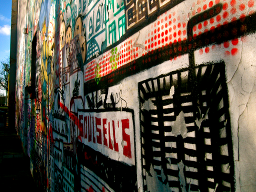 Le regard en est pour quelque chose. Si mon regard s’est étourdi à Stockholm parce que toujours simultanément captivé par le sol, l’horizon et le ciel, Berlin attire l’œil par ses murs. Le jeu de mot est horrible, mais les murs de Berlin sont ce qui me rattache à cette ville en tant que déambulateur (autrement, ce sont surtout les gens, la culture, les lieux, la liberté qui s’y dégage, etc.). Les bâtiments de l’est, gigantesques forteresses qui abritent tant de gens, me fascinent puisque je sais que plusieurs d’entre eux ont été construits dans les pires moments, sans compter que certains des locaux sont encore vides! D’autres bâtiments, plus nombreux à l’ouest, brillent des reflets sur le verre et sur le métal. Les structures du S-Bahn attirent autant que la ligne d’horizon qu’on voit parfois, au loin. Les rues sont si vastes que le ciel nous paraît minuscule.