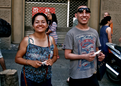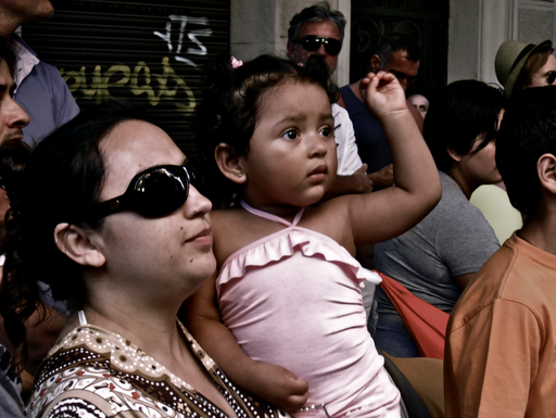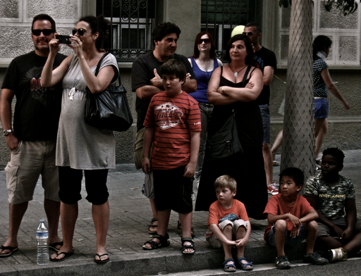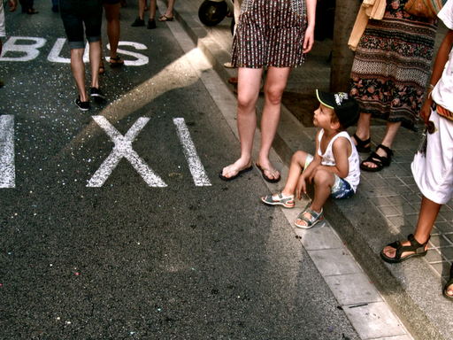 C’est en voyant un enfant pleurer à la vue d’une créature effectivement terrifiante que mon attention fut attirée ailleurs, vers les autres qui, comme moi, étaient là pour voir. Les cris de l’enfant, puis les rires d’une bande à mes côtés, ont réglé le problème que je voyais dans l’immobilité : la position de spectateur n’était plus passive. Qu’ils se réfugient derrière leurs caméras ou leurs cris, tous ceux qui sont ici réagissent. Certains rient, d’autres pleurent, la plupart sourient à grandes dents, semblent jouir d’une rare ivresse. D’autres encore sont perplexes, voire agacés, mais nul n’est là sans le vouloir, nul ne dort ni ne ferme les yeux. Les spectateurs étant plus difficiles à photographier, j’ai tout de même déambulé parmi vieillards dérangés, femmes seules et enjouées, couples ouverts, enfants curieux, afin de faire le lien et de briser la frontière entre ceux qui paradent et ceux qui regardent.