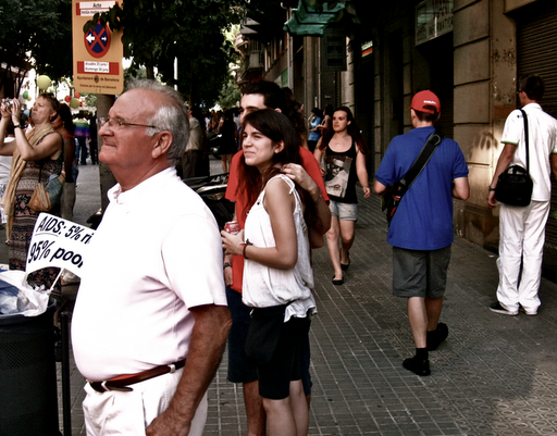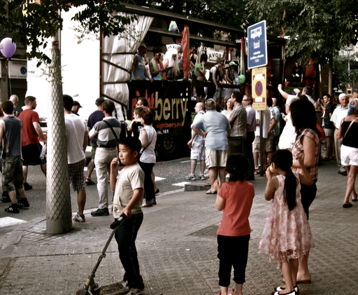 Rapidement, je me suis aperçu que le meilleur moyen d’y arriver n’était pas sur le trottoir, mais bien dans la rue, parmi les créatures, les nudistes, les sadomasochistes, les associations, les bears, les drag-queens, les monstres, les cracheurs de feu, les clowns, les jongleurs, les chars allégoriques, les discothèques de fortune, les manifestants et surtout les autres photographes : je n’étais pas du tout le seul à me joindre à la rue et j’eus vite le même visage euphorique de celles et ceux qui s’y promenaient. Là, entre spectateurs et acteurs, un lien dynamique s’opérait. À cet endroit, la dimension collective se sentait à vif, concrètement.
