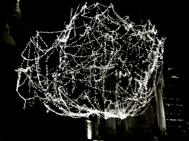 J’ai regardé le ciel qui passait rapidement du gris au noir, laissant cependant découvrir les éclairs du temps des fêtes. Les reflets sur la vitrine ressemblaient à des aurores boréales. Dans le noir, c’étaient des étoiles qui entouraient les arbres. J’ai pensé à cette église photographiée il y a quelques jours, presque laissée à l’abandon, mais dans laquelle on a tout de même posé des lumières festives. Je me suis souvenu que, chez moi, une grande étoile illuminée était accrochée. J’avais pris le temps de la photographier, elle aussi.