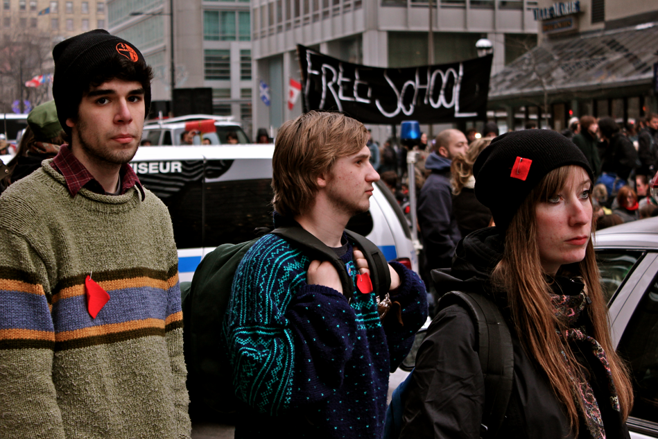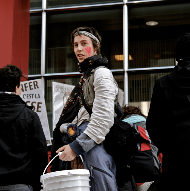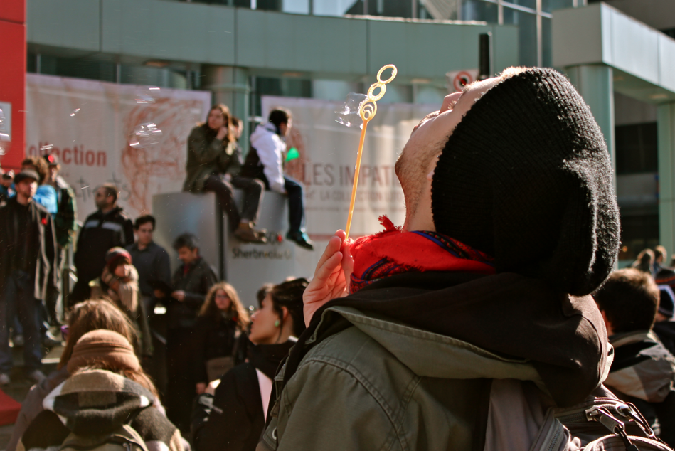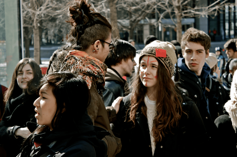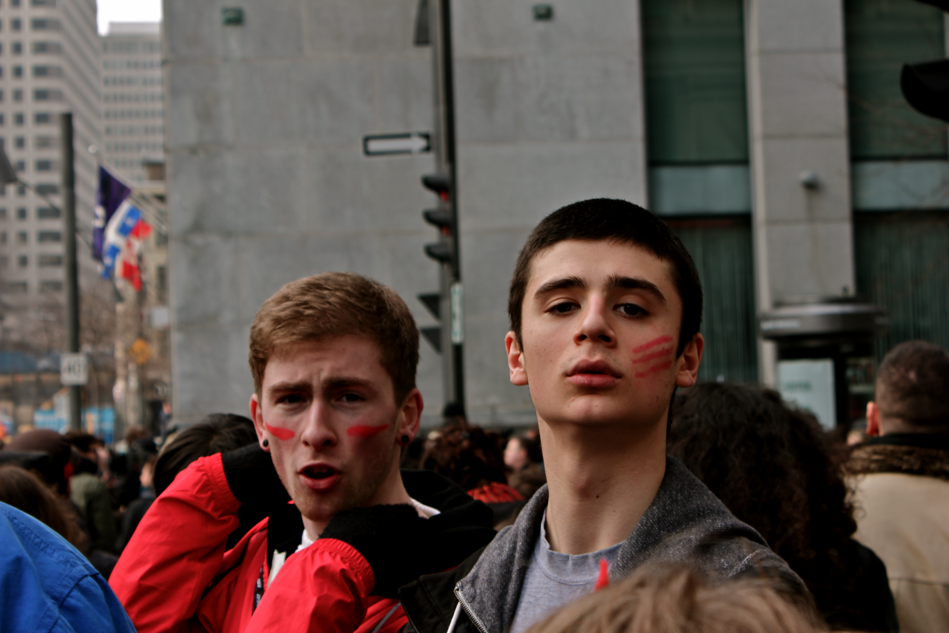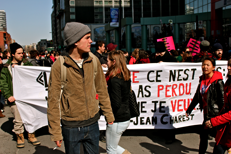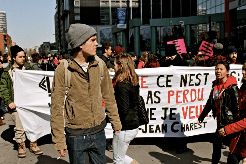 Lors de mes dernières déambulations, je n’ai pas cherché l’horizon. Mon regard ne portait pas très loin : il se buttait sans cesse sur des visages familiers, identiques à ceux que je vois en classe. Mes étudiants multipliés par mille à mes côtés partageaient avec moi un idéal bien plus grand que celui de voir l’horizon reculer à mon rythme, un idéal qui porte plusieurs noms et qui se définit à l’aide de tant et tant de concepts avec lesquels je suis d’accord, pour lesquels j’entretiens débats et chicanes, pour lesquels je porte des couleurs précises, pour lesquels je manifeste. Il s’agit pourtant du même idéal, celui de créer un monde meilleur, d’assurer collectivement notre place dans ce monde, de s’exprimer, de se faire entendre, de vivre mieux ensemble. On dit parfois changer le monde ; atteindre le bout du monde devient alors une mince affaire.