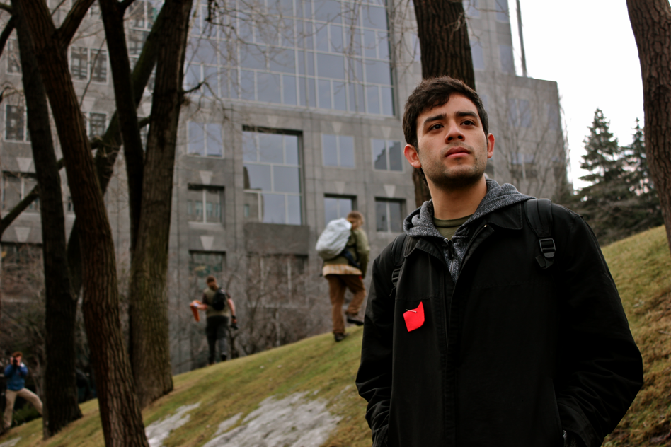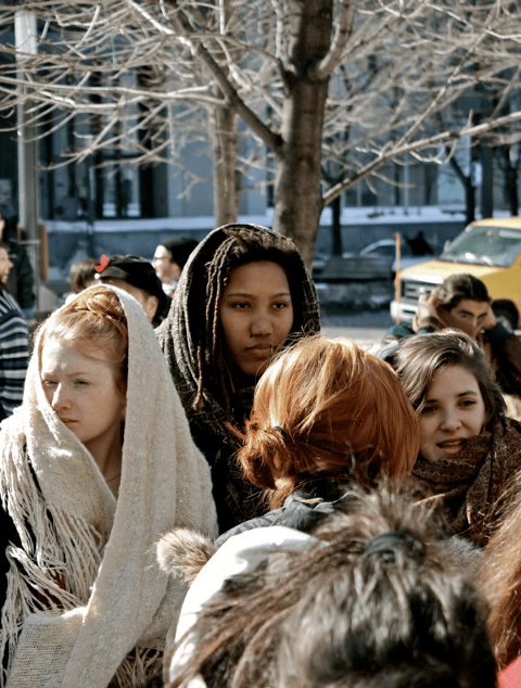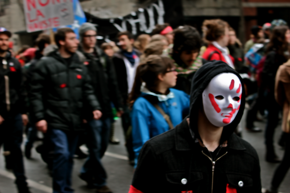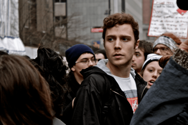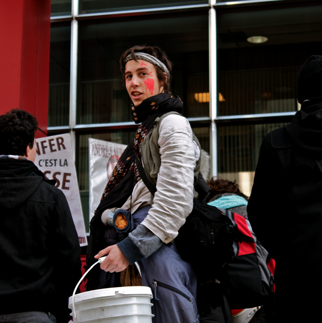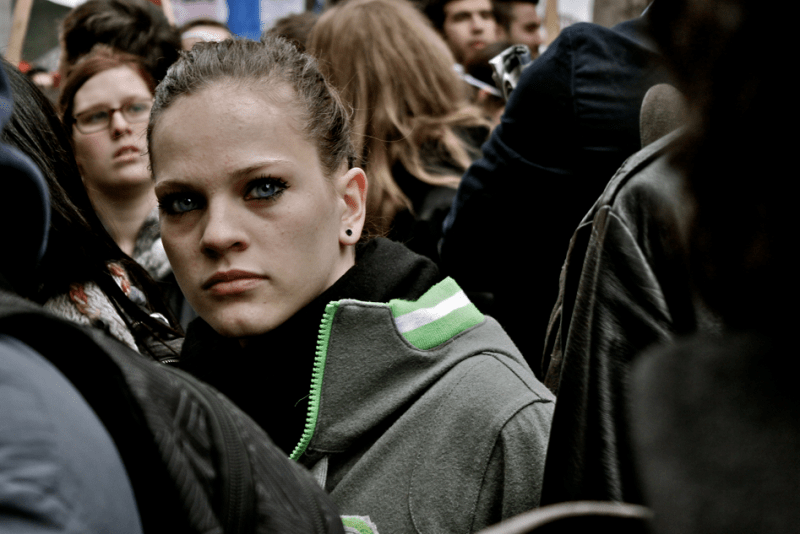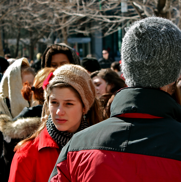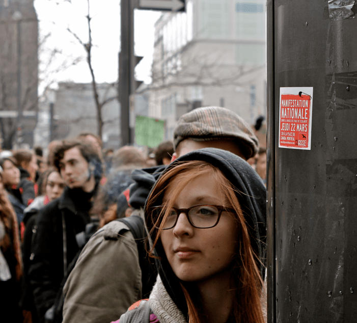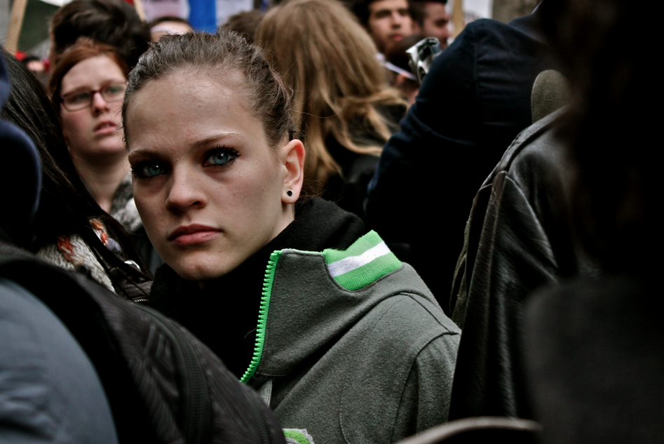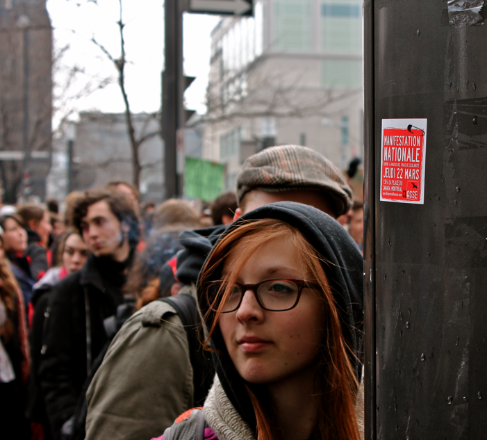 Pendant toutes ces manifestations, je voulais photographier l’événement pour le documenter et, éventuellement, le partager avec un groupe pour lequel je milite plus spécifiquement. Ce travail a été fait, mais entre deux clichés très « généraux », je me suis mis à photographier les visages de ces étudiants. Ils m’émeuvent, ces visages : je les connais fatigués, attentifs, impatients, intéressés. En enseignant, on oublie parfois que ces yeux sont aussi remplis d’une force capable de changer le monde. Je les publie ici comme le résultat de plusieurs déambulations/manifestations qui me donnent l’espoir en un monde meilleur. Cela est peut-être naïf, certes, mais voici où je voulais en venir : cet espoir est une obsession indispensable pour le déambulateur, car c’est lui qui lui donne son premier élan.