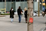 C’est pourquoi, muni de ma caméra qui a tant servi lors des manifestations, j’ai déambulé sans être en mesure de voir autre chose que les signes du mouvement actuel collés, affichés, graffités ou gravés sur les murs et sur les fenêtres de la ville. Mon regard ne suit que les carrés rouges et toute autre forme de désobéissance civile dont les restes s’accrochent encore au mobilier urbain, signe de la radicalité et de la créativité du mouvement. C’est avec fierté que je continue à photographier ces signes qui transforment le vandalisme en solidarité.
