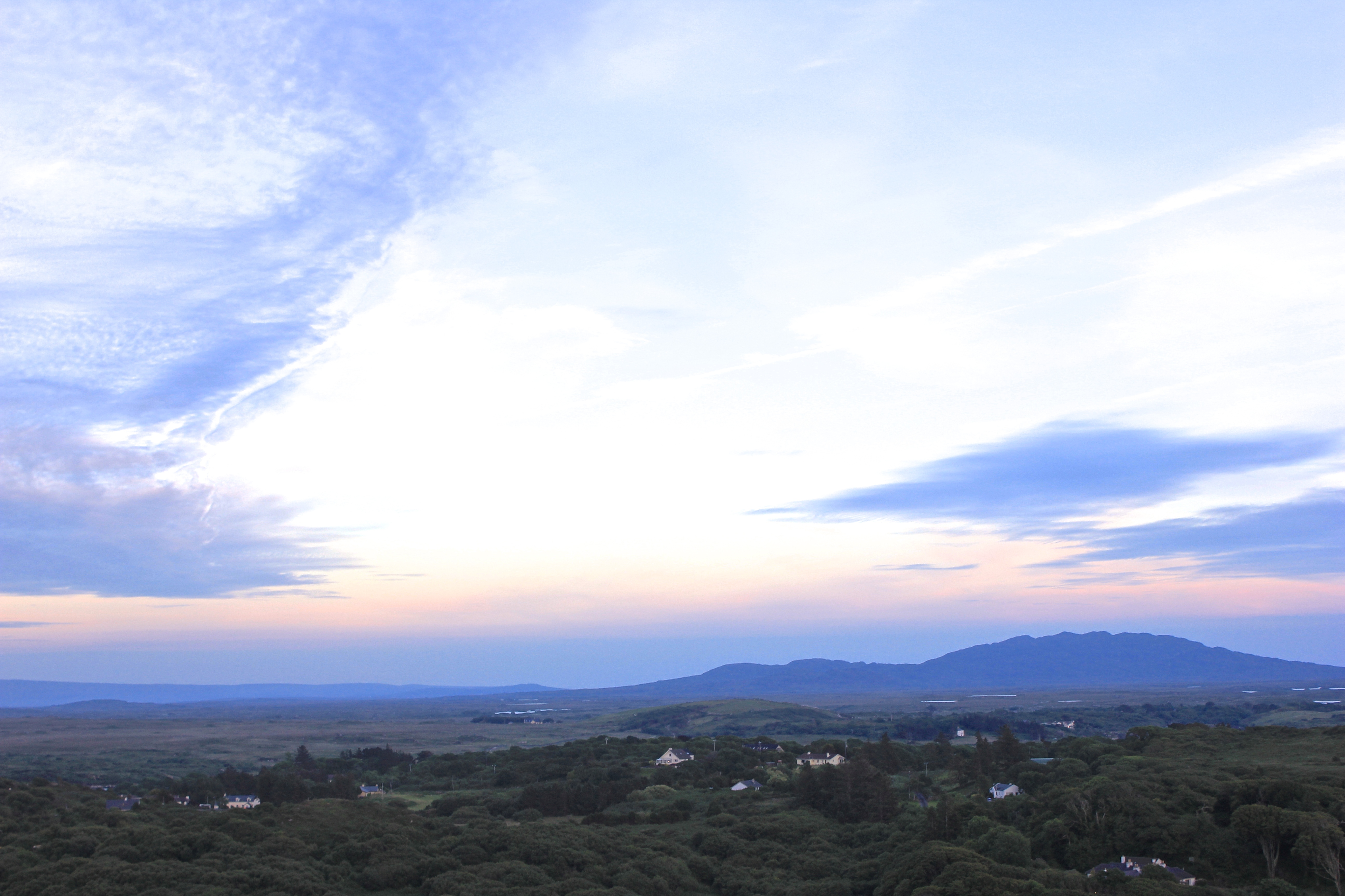 Sur Clifden, la nuit du printemps tombe tard et avec lenteur, toujours couverte de quelques nuages multicolores et des sons d’instruments qui se mêlent au vent. Clifden éparpille ainsi ses quelques secrets qui logent dans ses pubs sous le regard sobre et tout aussi voilé du D’Arcy Monument, petite niche en hommage au fondateur de la ville haut perchée au sommet d’une colline qui permet, si on s’y aventure, de contempler un splendide coucher de soleil et de contempler encore une fois, de penser, de lire et d’écrire inlassablement le paysage.