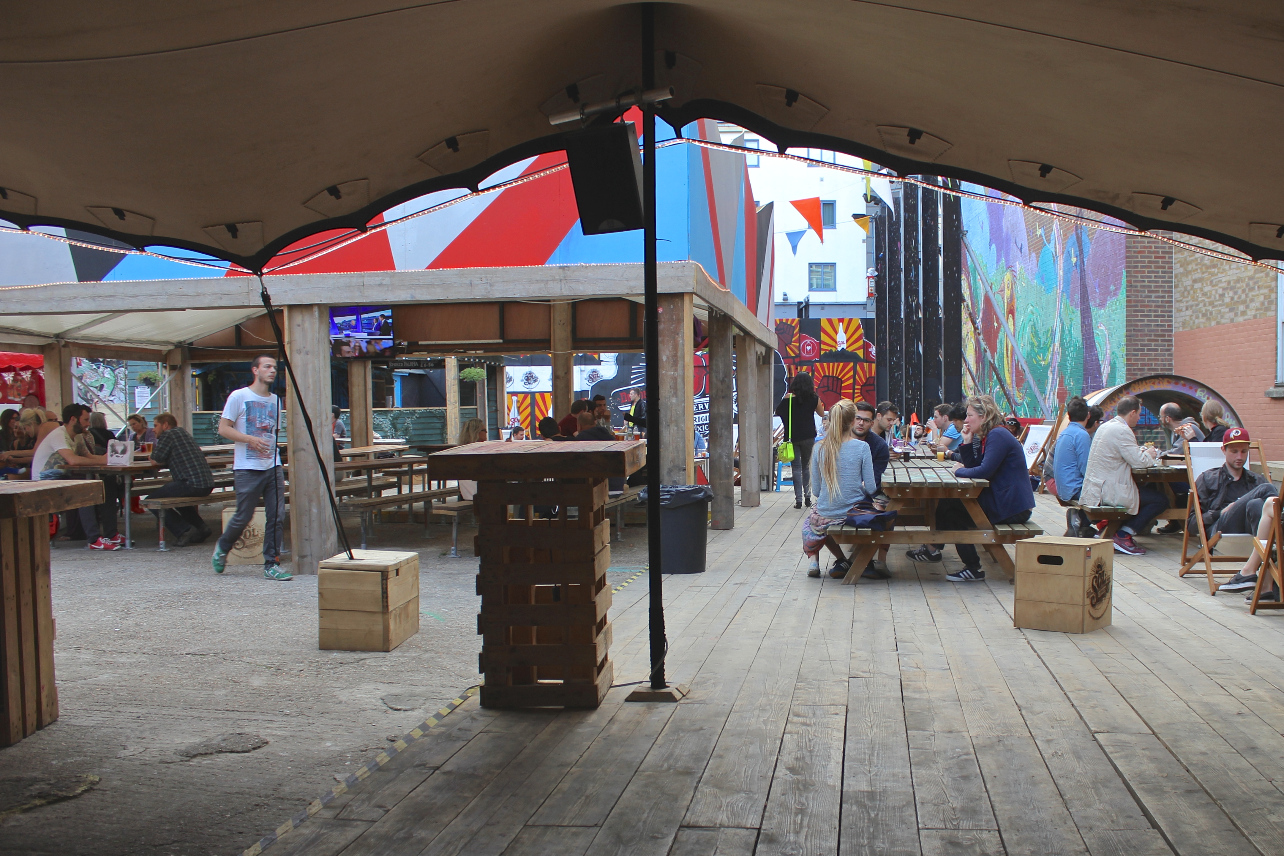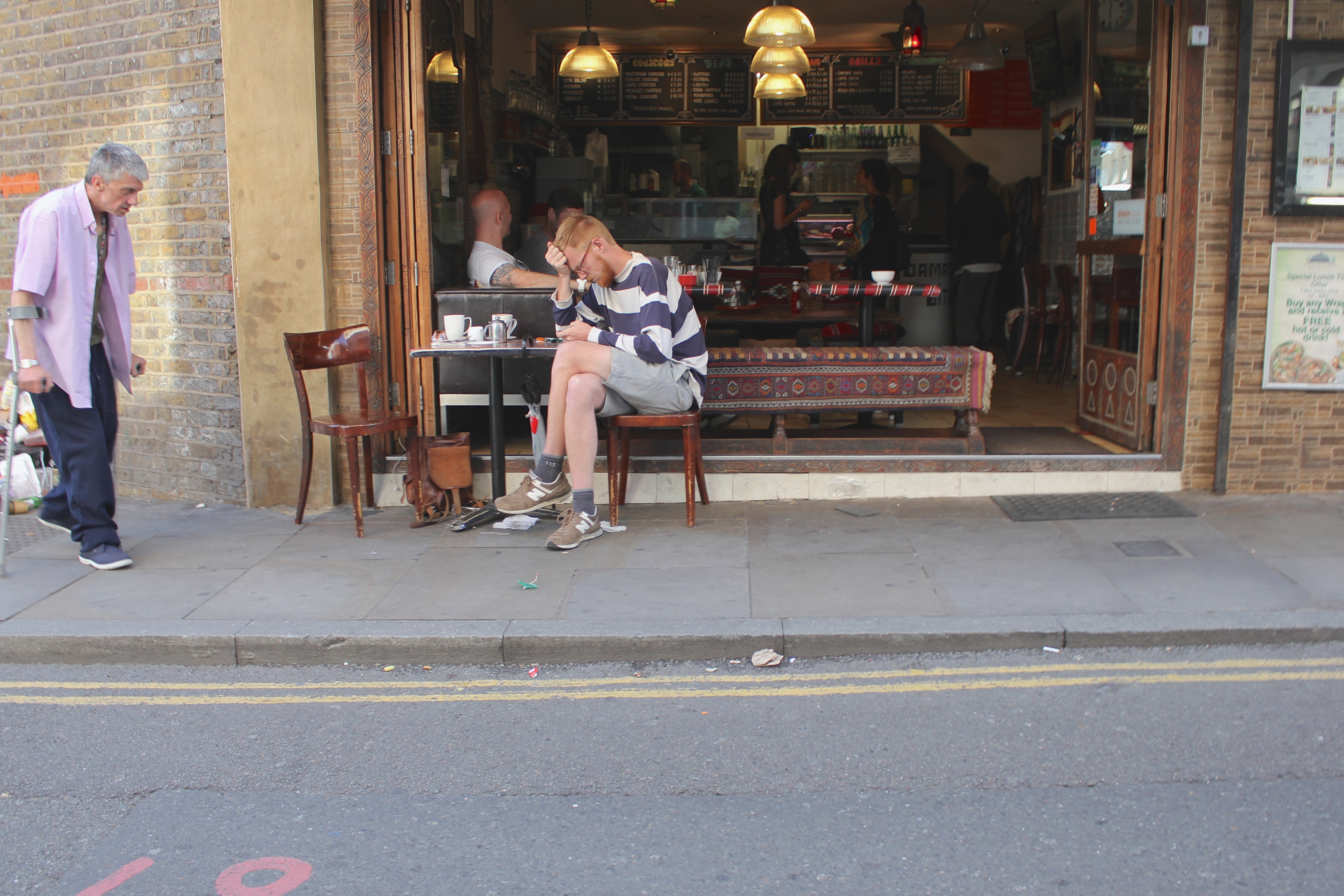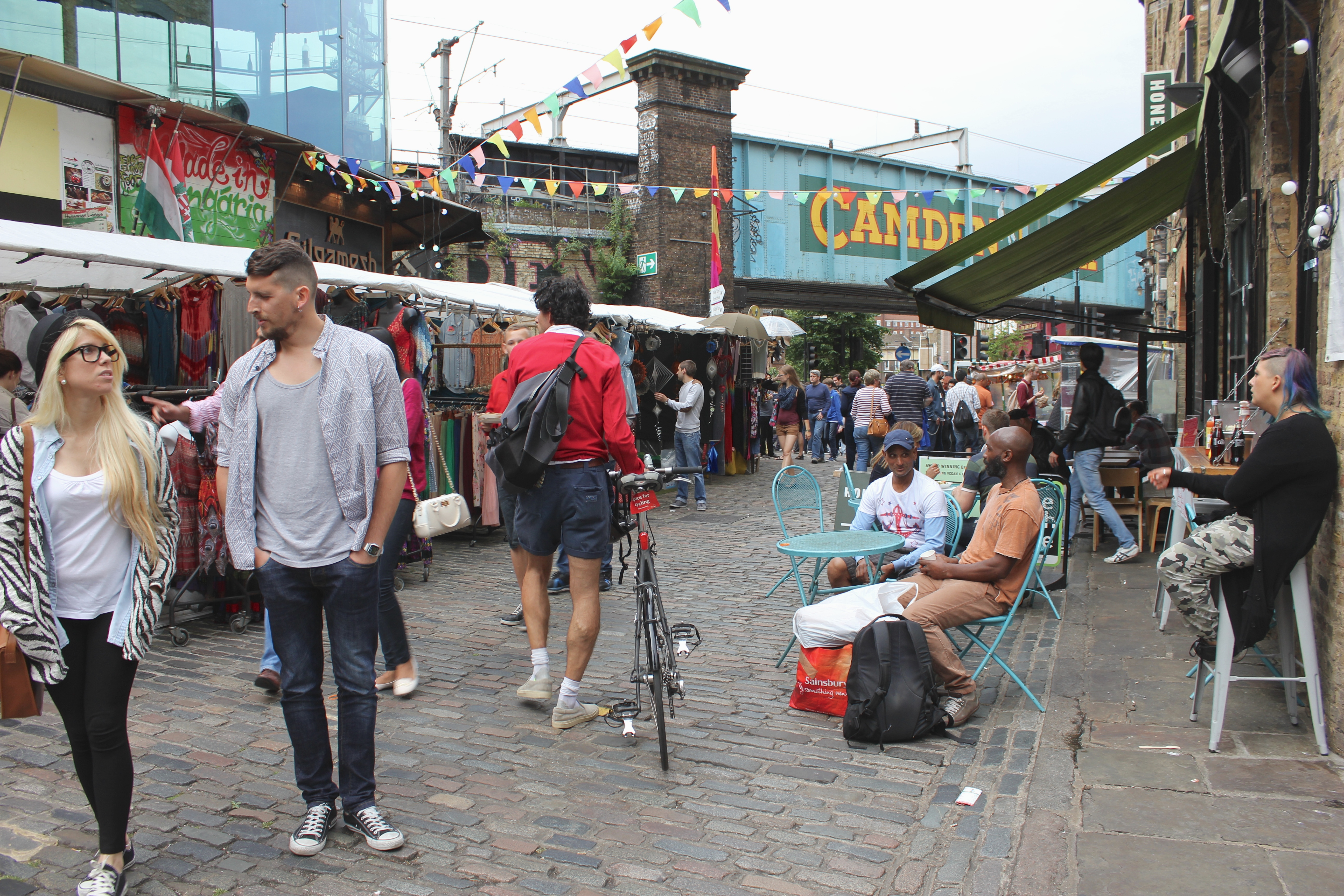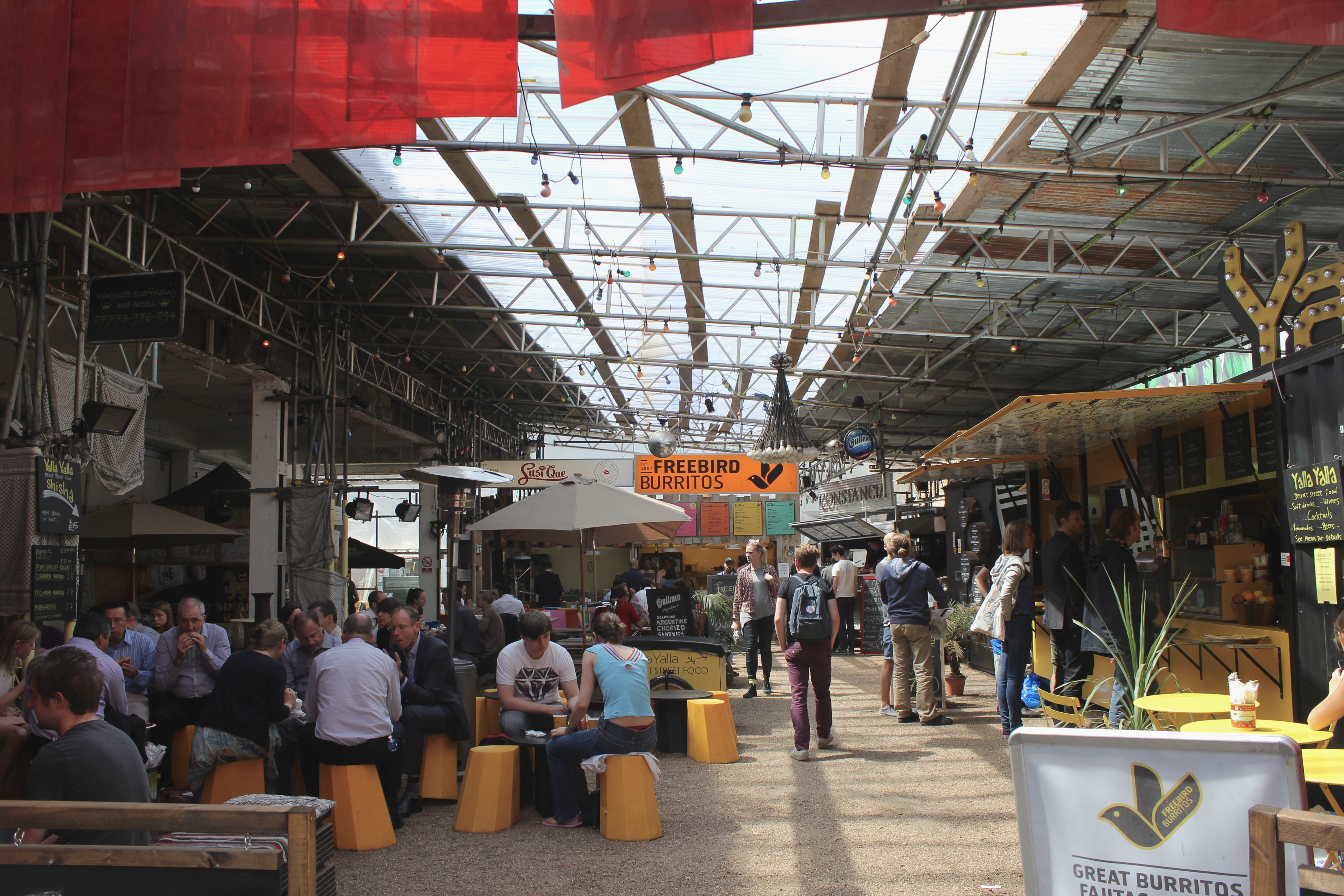 Tout au long de nos déambulations dans les différents quartiers de Londres, nous butions contre des tables, des chaises, des verres et des gens installés pour manger, boire et discuter. C’est le « déboulement » à Londres qui m’a le plus marqué : partout où nous passions – dans une ruelle entre deux buildings et dans des anciens containers de Shoreditch, dans un espace bétonné jadis vacant, dans des installations d’un marché abandonné de Brixton, sur une rue piétonnière d’Angel, dans les passages du Camden Lock, dans un chantier fermé pour la fin de semaine, dans le Borough Market – se trouvaient un marché public, une terrasse improvisée, un endroit parfait pour se nourrir de repas du monde entier faits sur place, pour boire une bière locale ou un cocktail préparé sous nous yeux. Contrairement aux food trucks trop chers, trop élitistes et trop règlementés de Montréal, ces cuisines publiques londoniennes répandaient à tous les jours une ambiance de liberté et d’une certaine justice (le prix de plusieurs de ces mets étaient dérisoires), tuant du même coup une drôle de réputation dont souffre la ville auprès des étrangers : à Londres, contrairement à ce que certains disent, on mange terriblement bien. Non seulement on mange bien, mais on mange librement sur le bord d’un trottoir ou d’un cours d’eau, devant un arbre ou une église, assis sur l’asphalte, sur l’herbe, sur un banc de parc ou sur un mobilier de fortune installé expressément pour déguster ce repas délicieux – curry indien, pulled pork, sandwich au rôti de bœuf, pad thai, paella, scotch egg, burger, fromages, charcuteries, pain, café latte de troisième type, thé, scones aux confitures et à la clotted cream. À tous les jours, on peut tomber sur un de ces endroits magiques (et pourtant si banals pour plusieurs tant ils sont nombreux) sans avoir à vérifier d’avance, à réserver.