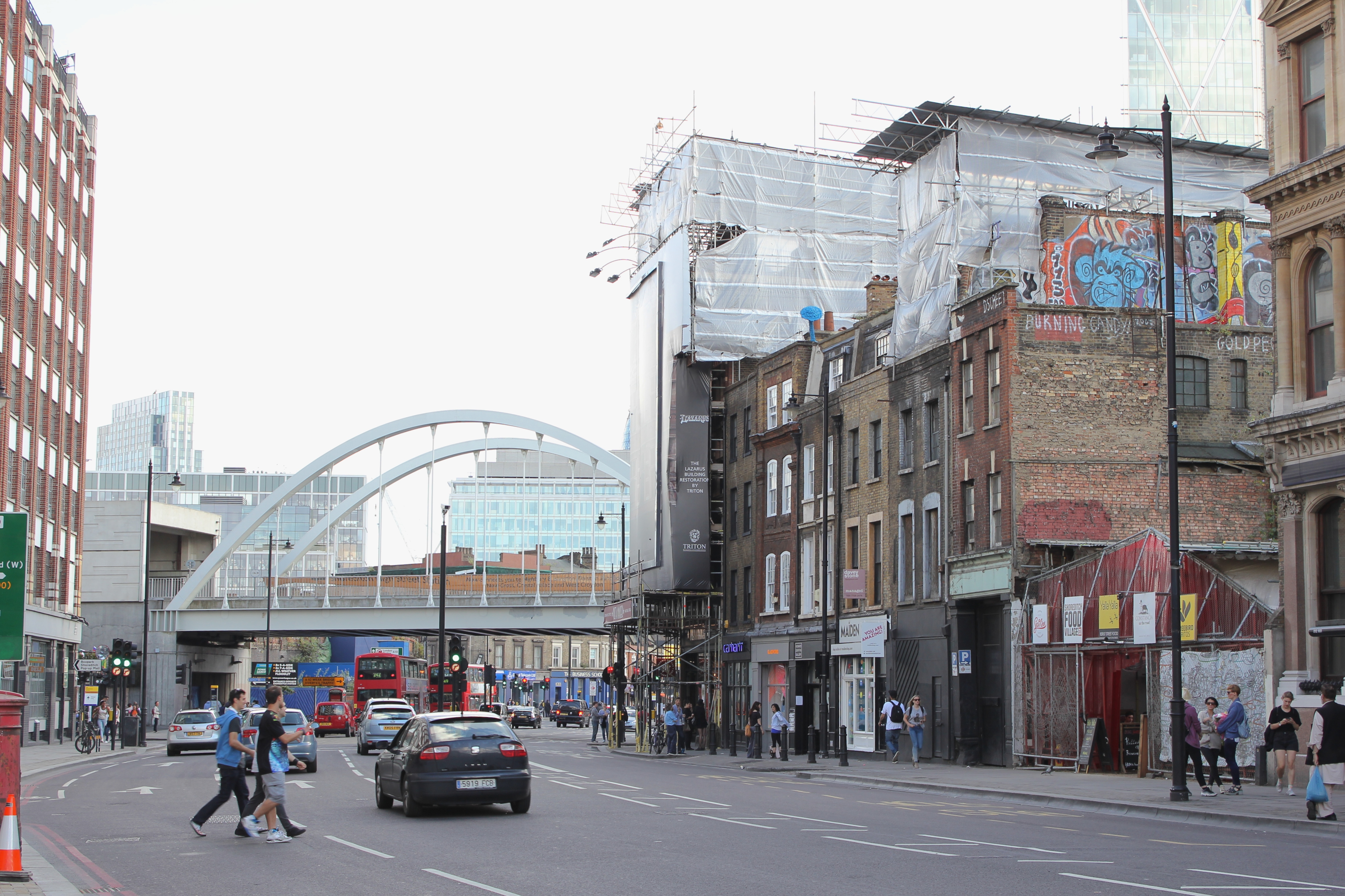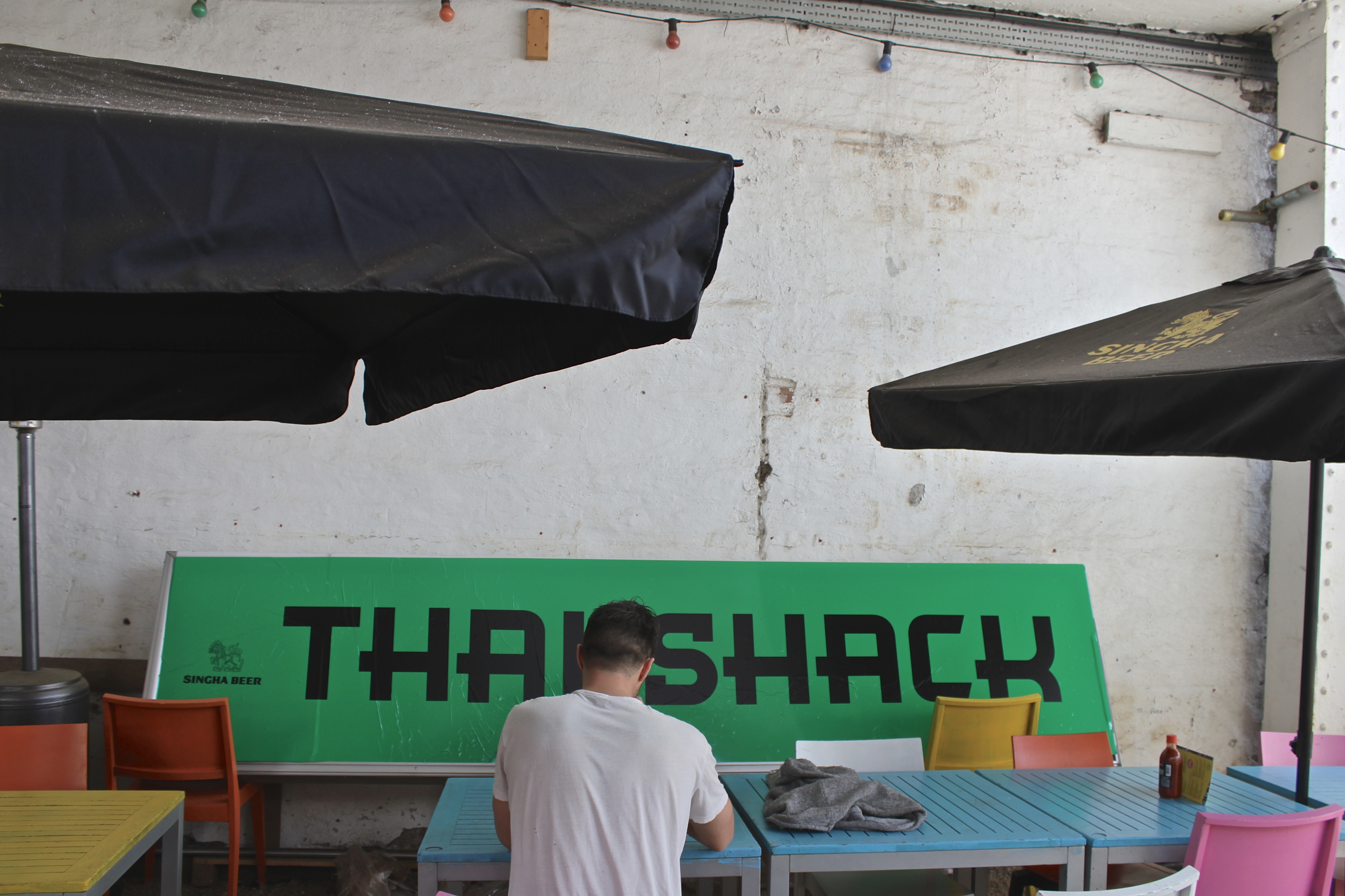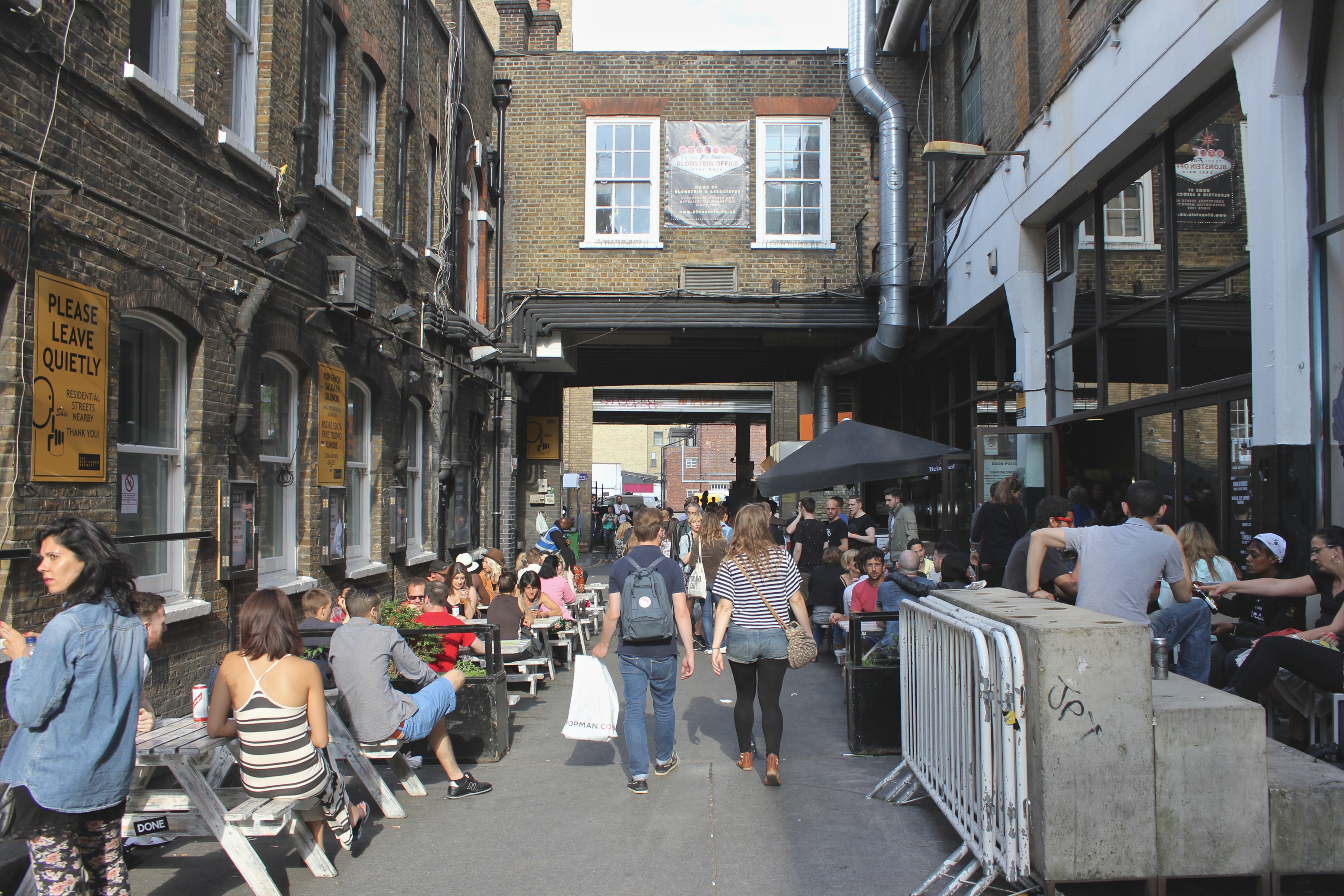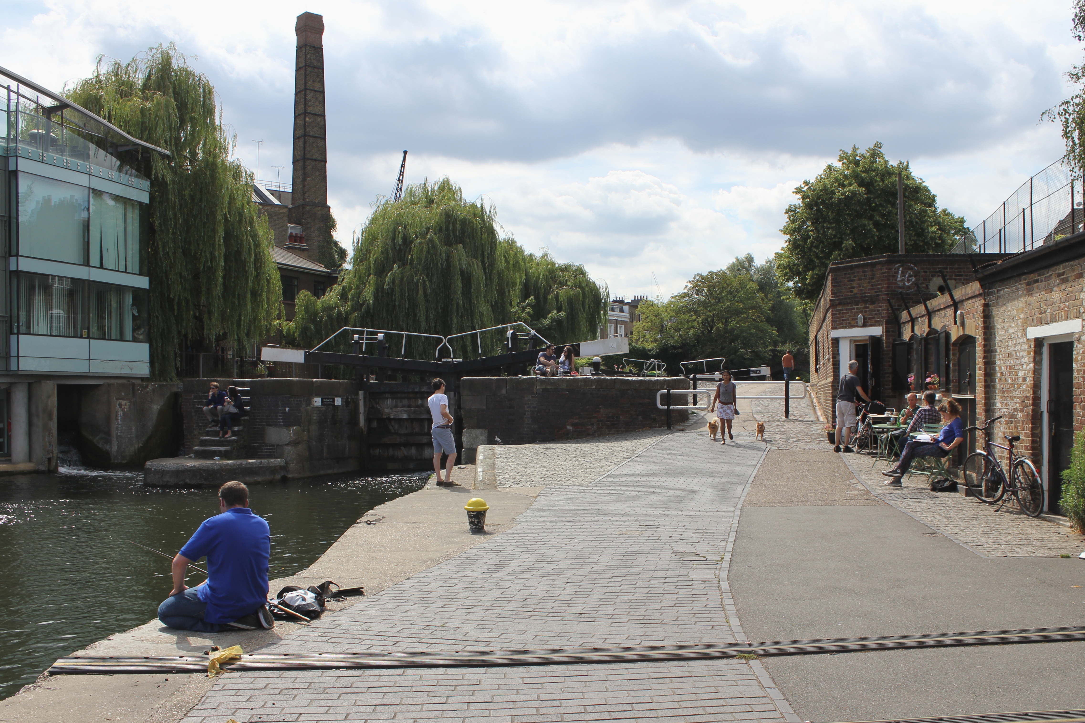 Tout au long de nos déambulations dans les différents quartiers de Londres, nous butions contre des tables, des chaises, des verres et des gens installés pour manger, boire et discuter. C’est le « déboulement » à Londres qui m’a le plus marqué : partout où nous passions – dans une ruelle entre deux buildings et dans des anciens containers de Shoreditch, dans un espace bétonné jadis vacant, dans des installations d’un marché abandonné de Brixton, sur une rue piétonnière d’Angel, dans les passages du Camden Lock, dans un chantier fermé pour la fin de semaine, dans le Borough Market – se trouvaient un marché public, une terrasse improvisée, un endroit parfait pour se nourrir de repas du monde entier faits sur place, pour boire une bière locale ou un cocktail préparé sous nous yeux. Contrairement aux food trucks trop chers, trop élitistes et trop règlementés de Montréal, ces cuisines publiques londoniennes répandaient à tous les jours une ambiance de liberté et d’une certaine justice (le prix de plusieurs de ces mets étaient dérisoires), tuant du même coup une drôle de réputation dont souffre la ville auprès des étrangers : à Londres, contrairement à ce que certains disent, on mange terriblement bien. Non seulement on mange bien, mais on mange librement sur le bord d’un trottoir ou d’un cours d’eau, devant un arbre ou une église, assis sur l’asphalte, sur l’herbe, sur un banc de parc ou sur un mobilier de fortune installé expressément pour déguster ce repas délicieux – curry indien, pulled pork, sandwich au rôti de bœuf, pad thai, paella, scotch egg, burger, fromages, charcuteries, pain, café latte de troisième type, thé, scones aux confitures et à la clotted cream. À tous les jours, on peut tomber sur un de ces endroits magiques (et pourtant si banals pour plusieurs tant ils sont nombreux) sans avoir à vérifier d’avance, à réserver.