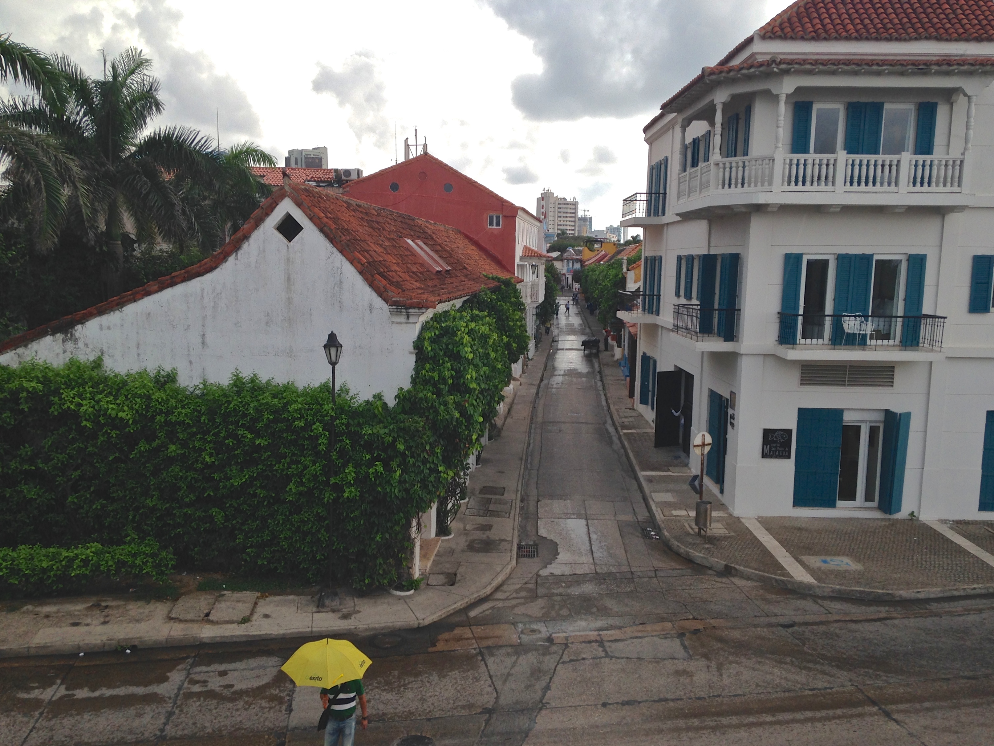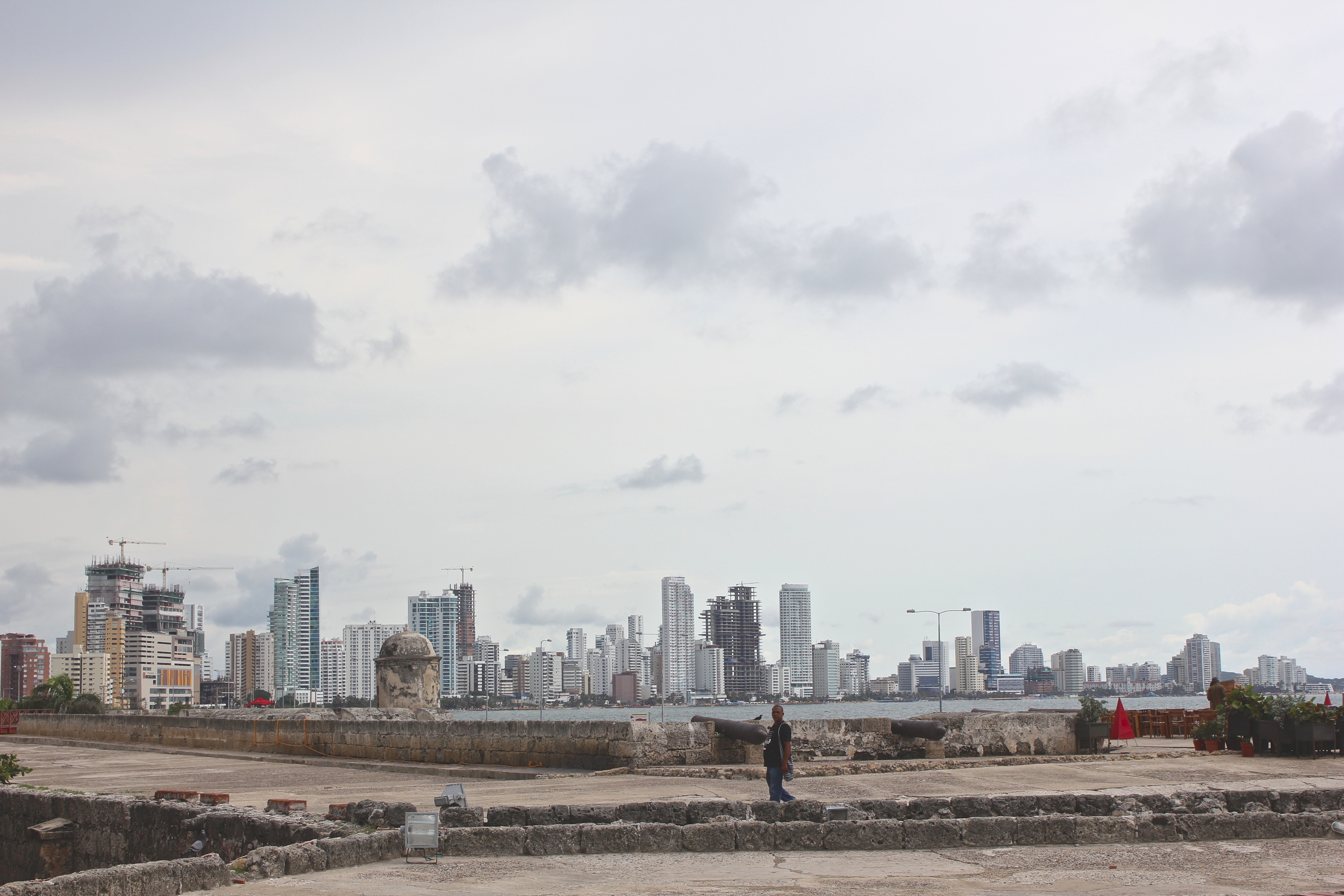 Bien que rempli d’obligations, ce voyage en est tout un, d’autant plus confrontant qu’il me déplace de la distance souvent confortable du voyageur en pays inconnu : j’affronte tête première les gens qui vivent ici, qui me reçoivent généreusement et fièrement avec leurs coutumes et leur culture. Cette fois, impossible de faire l’autruche en détournant mon regard de ce qui me confronte pour l’élever vers le ciel, ce refuge éternel de l’étranger. À Cartagena, même le ciel est un obstacle, gorgé d’une humidité qui rend la vie impossible aux lunettes ophtalmologiques, prête à faire éclater les nuages d’une seconde à l’autre : dans le gris/noir à l’horizon se lit la menace quotidienne en cette saison des pluies : le soleil radieux sera bientôt couvert et cèdera sa place à des orages dignes des films d’horreur.